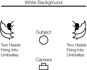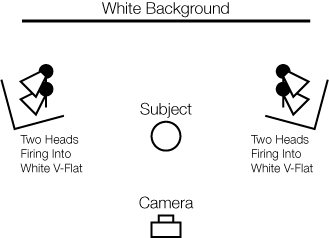 The two ways that we can enlarge our light sources are through diffusion and reflection. Although diffusion works well in creating an even wash, reflected light works even better when bounced off a matte white surface. The two favorite reflection tools of the pros are white umbrellas and white v-flats (4'X8' sheets of foam core taped together, like a book). Lets look at how these setups are executed, without worrying about controlling light spill yet: