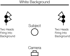 Achieving Pure White Backgrounds Prerequisite skills: -Basic camera operation Creating a pure white background can be one of the most difficult and frustrating exercises for a beginning photographer. Many theories and "formulas" exist for achieving pure white, but in reality, achieving pure white is more importantly a matter of managing and avoiding the negative side effects that can accompany a high-key lighting situation. Making the background white is the easy part of the setup. In a portrait situation, this can be accomplished by overpowering a white wall or roll of seamless paper behind your subject with light, opening up the aperture on your camera until the background is over-exposed, or a combination of both. However, as many of you have no doubt encountered, your images do not turn out the way that you expect. Camera flare, loss of edge contrast, uneven background exposure, and washed-out colors (less saturation) are all problems associated with shooting on white. It is the same set of problems that exist when shooting an outdoor portrait photo into the sun. Now, for the fashion and art shooters, this is a technique they use to create a "look", but for those aiming to create a properly exposed image on white, some adjustments need to be made. Let's look at our intial setup and see if we can improve our process: