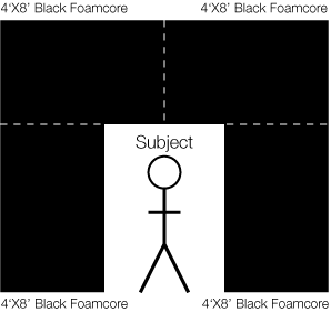 This is an actual setup used by the pros, but not necessary or feasible for everyone. I have used this example to emphasize the importance of eliminating excess light from hitting the camera lens. At its most basic, any light bouncing off of the white background that is not within the frame of composition when you look through your camera is not necessary and should be eliminated. The exception is if you or your subject will be moving, and therefore the space around the subject should be expanded. Black curtains, "flags", duvetyne, and black foamcore are just some of the materials that you can use around your subject. The materials that you use can vary, but they should be black and absorb excess light. The subject(s) should sit or stand in front of the black framing material to prevent excess light from hitting them. Pro photographers will even shoot with the black material in the frame as close around the subject as possible and remove it later in Photoshop, because this increases contrast even further. Let's look at our setup now from above: