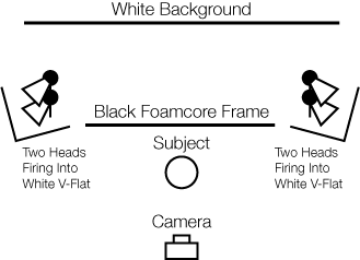 The two ways that we can enlarge our light sources are through diffusion and reflection. Although diffusion works well in creating an even wash, reflected light works even better when bounced off a matte white surface. The two favorite reflection tools of the pros are white umbrellas and white v-flats (4'X8' sheets of foam core taped together, like a book). Lets look at how these setups are executed, without worrying about controlling light spill yet: